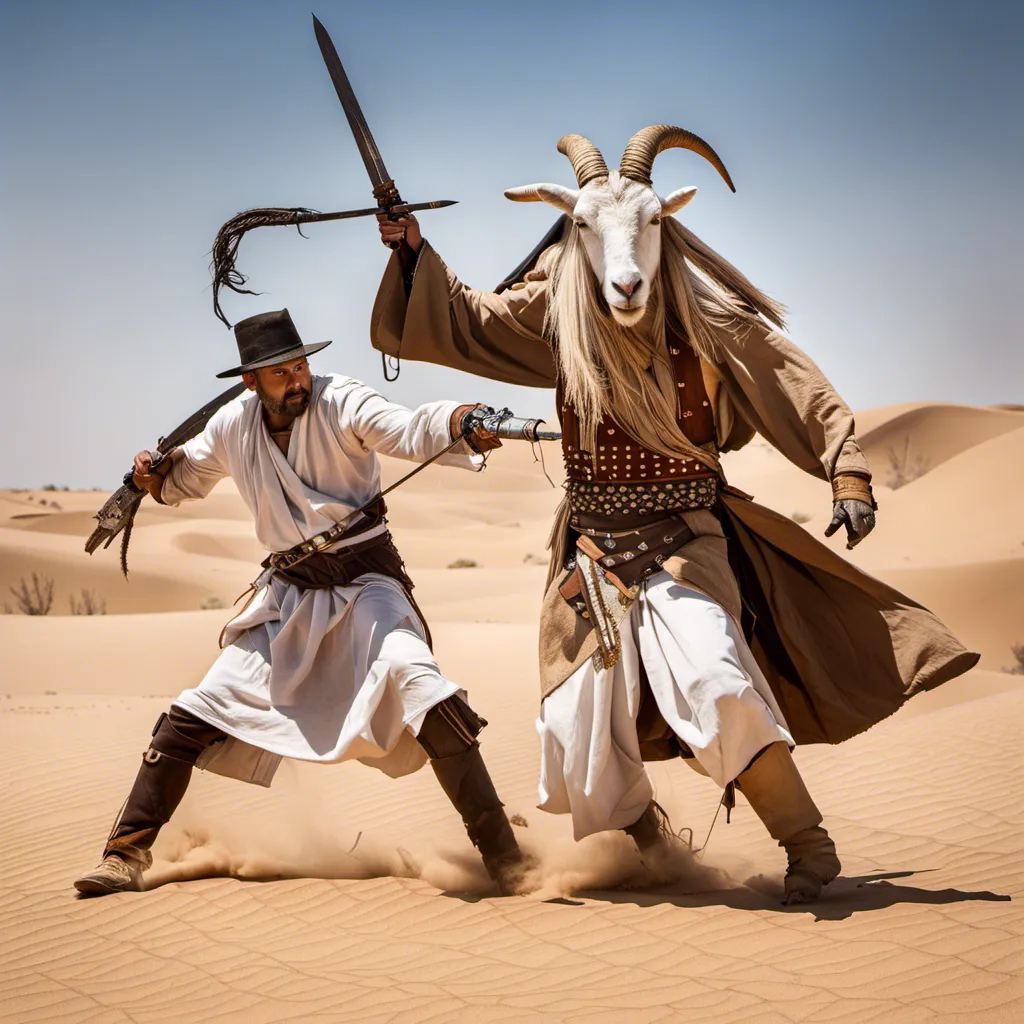 - Desert Duel: Under the merciless desert sun, the goat, a lone wanderer and sword master, faces off against an old rival. Sand whirls, blades clash, and past betrayals echo in a dance of fate and steel. Camera settings: Full-frame DSLR, 50mm, f/1.8, 1/1000 sec, ISO 100.