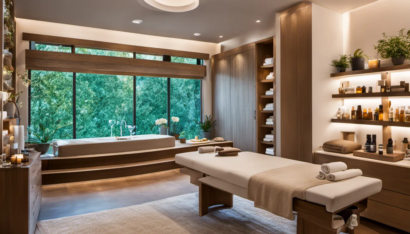 Imagine stepping into a spa where the air is filled with the soothing scents of essential oils. Our first image showcases an aromatherapy-focused spa with shelves lined with essential oils and diffusers. The tranquil treatment room, bathed in soft, diffused lighting, promises an escape from the stresses of the world.